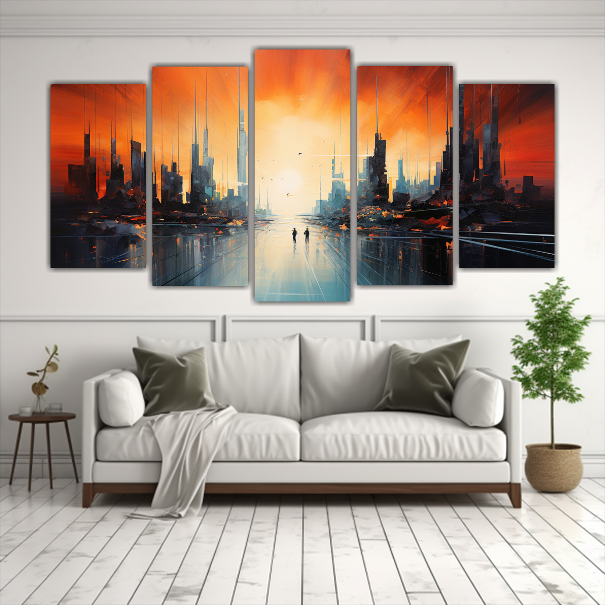 DecoCuadros presenta el set de 5 artes estilo galería de armonía cromática Este cuadro abstracto representa una bulliciosa ciudad en tonos coral, gris, azul marino grisaceo, carmesí, beige y chocolate Impreso en tela de alta calidad con bastidores de madera, es la elección perfecta para añadir un toque de dinamismo y elegancia a tu hogar Aprovecha nuestros precios económicos y la rapidez de nuestras entregas gratuitas en Santiago y envíos express a regiones