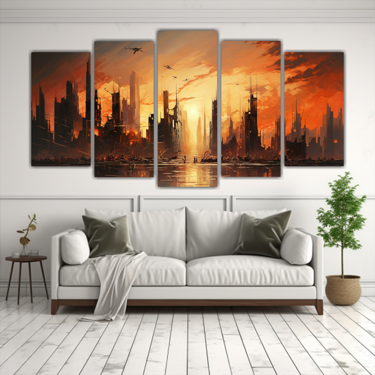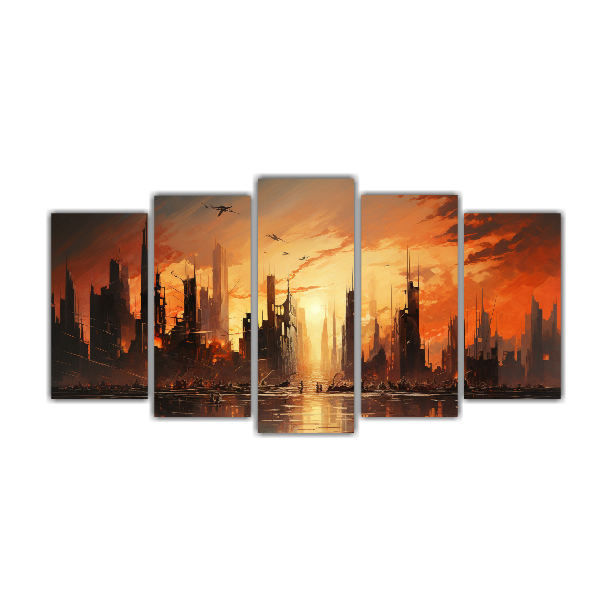 Decora tus paredes con el Cuadro Abstracto Dinámico de una Ciudad Bulliciosa Este set de 5 lienzos de alta calidad impresos en tela y con bastidores de madera, representa una ciudad llena de movimiento y energía Los colores Coral, Azul Marino grisaceo, Carmesí, Chocolate, Amarillo Claro y Gris dan vida a esta obra de arte En DecoCuadros ofrecemos los mejores precios del mercado y entregas rápidas y gratuitas en Santiago ¡Atrévete a llenar tus espacios con diseño y estilo!