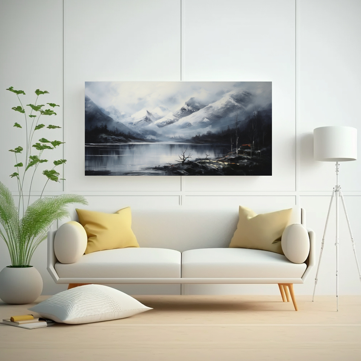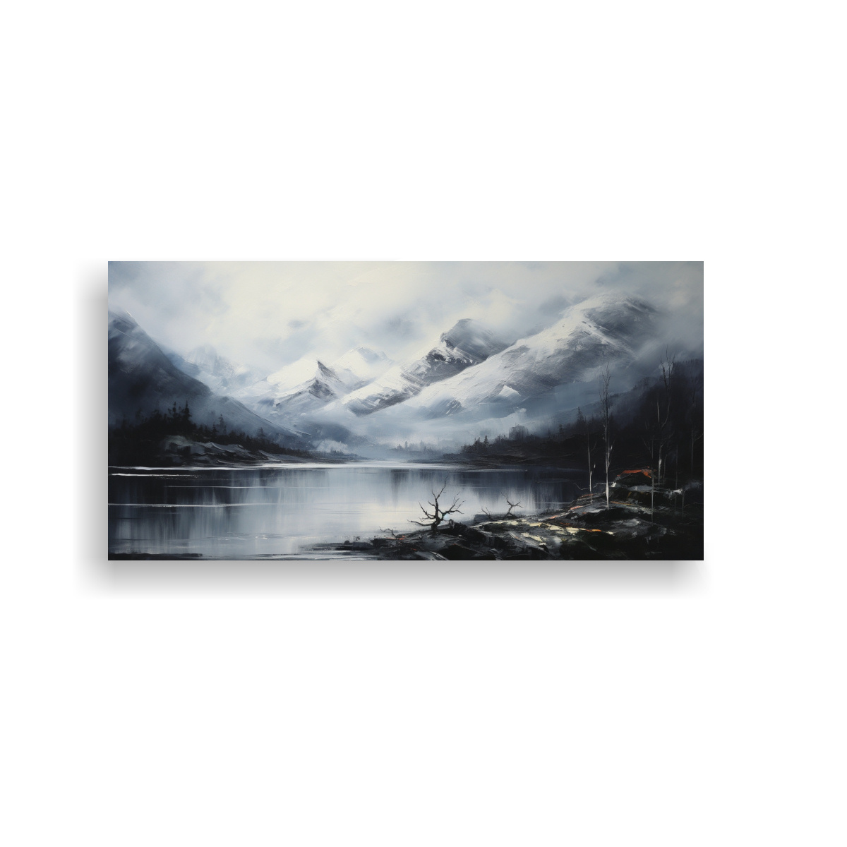 Cuadro Abstracto Dinámico: Montañas Junto Al Lago Con Colores Negros.