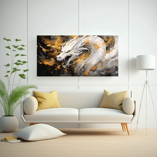 Coloca este cuadro Abstracto: Dragón en Blanco y Oro en tu sala de estar para añadir un toque de misterio y sofisticación Combínalo con muebles en tonos neutros y accesorios en colores dorados para crear un ambiente elegante y vanguardista