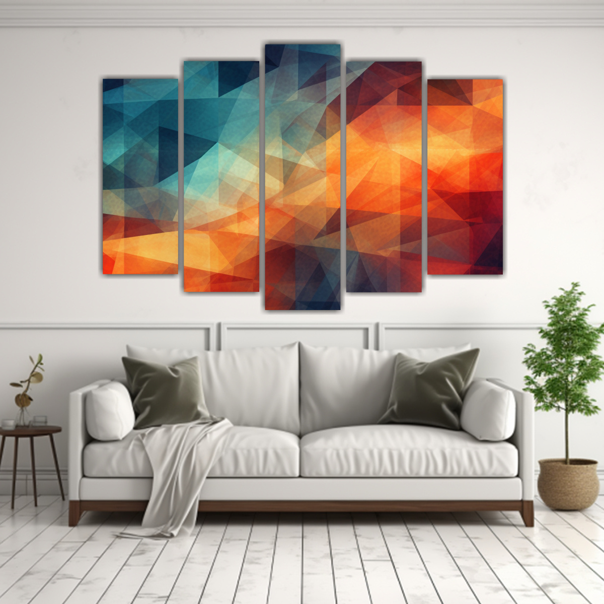 Este cuadro abstracto de tonos Azul Marino grisáceo, Coral, Carmesí, Gris, Menta es perfecto para decorar tu sala de estar o tu oficina Colócalo sobre un sofá de color neutro para resaltar su elegancia o en una pared blanca para un contraste moderno y sofisticado