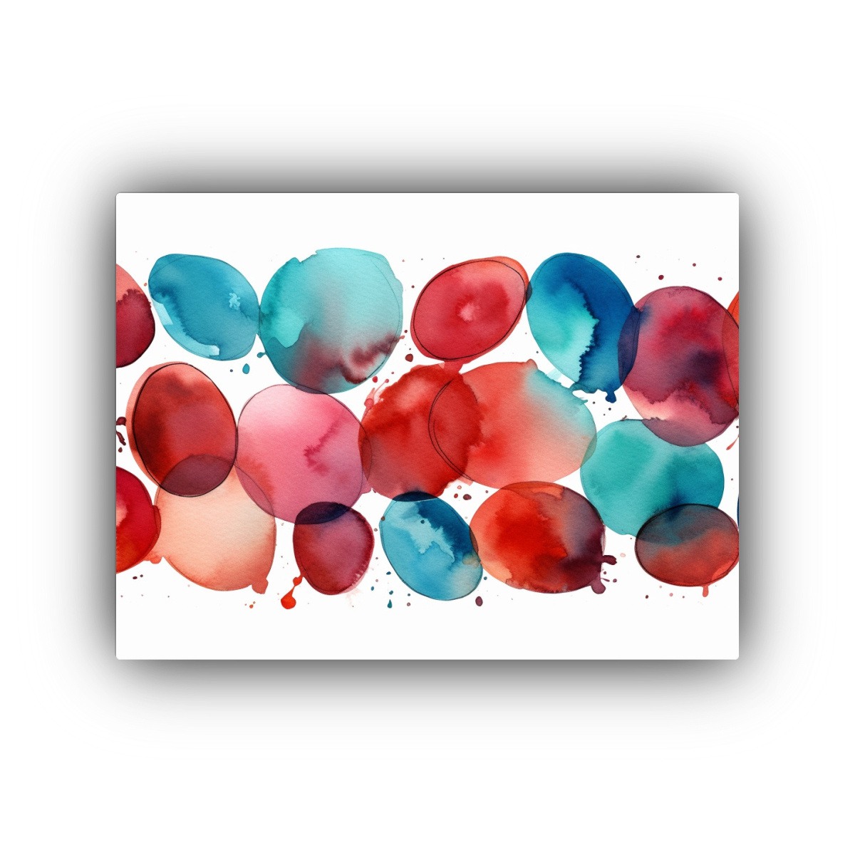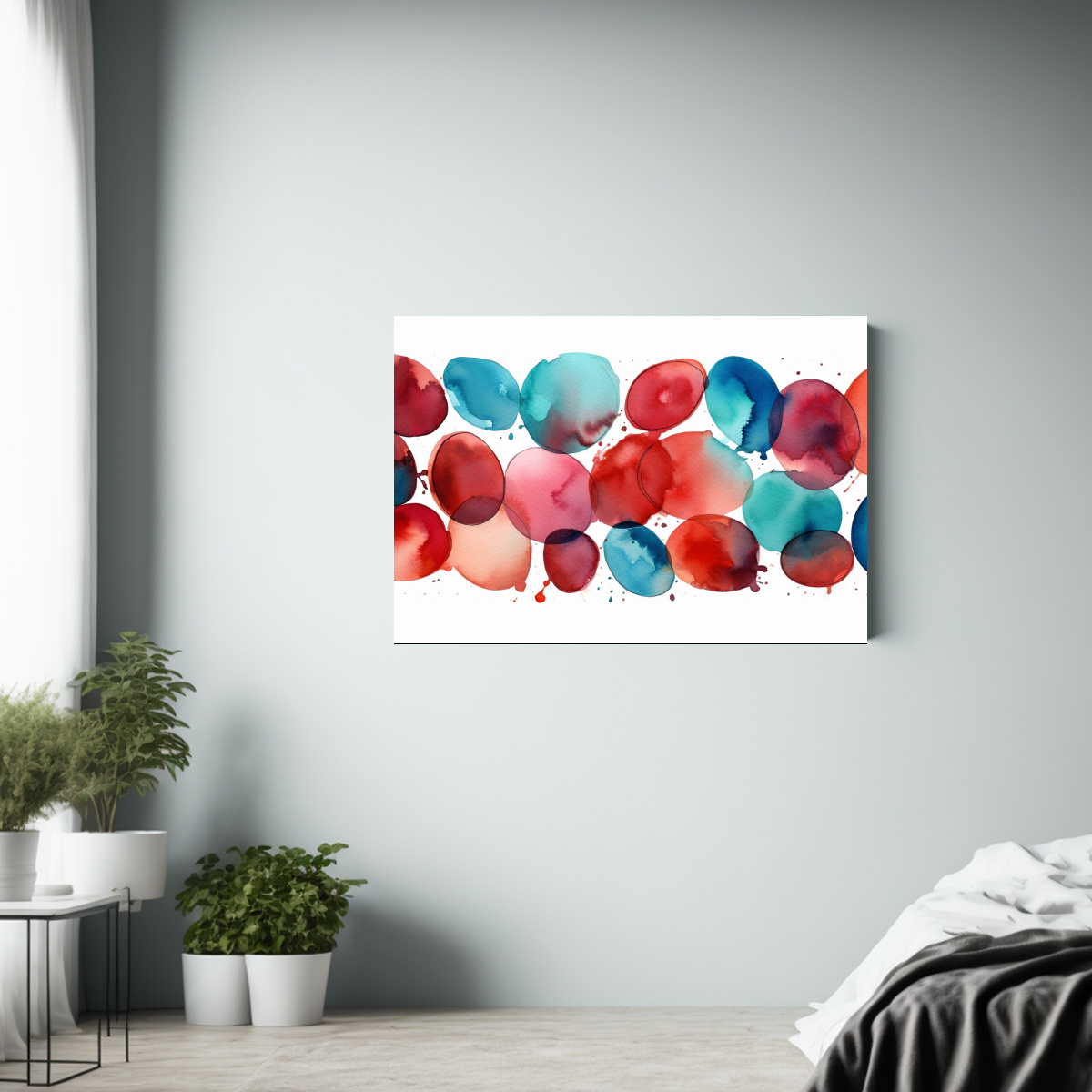 Este cuadro abstracto en acuarela de color carmesí y turquesa sería ideal para decorar tu sala de estar, creando un punto focal llamativo sobre un sofá de color neutro Combínalo con cojines en tonos turquesa y carmesí para lograr una decoración armoniosa y moderna