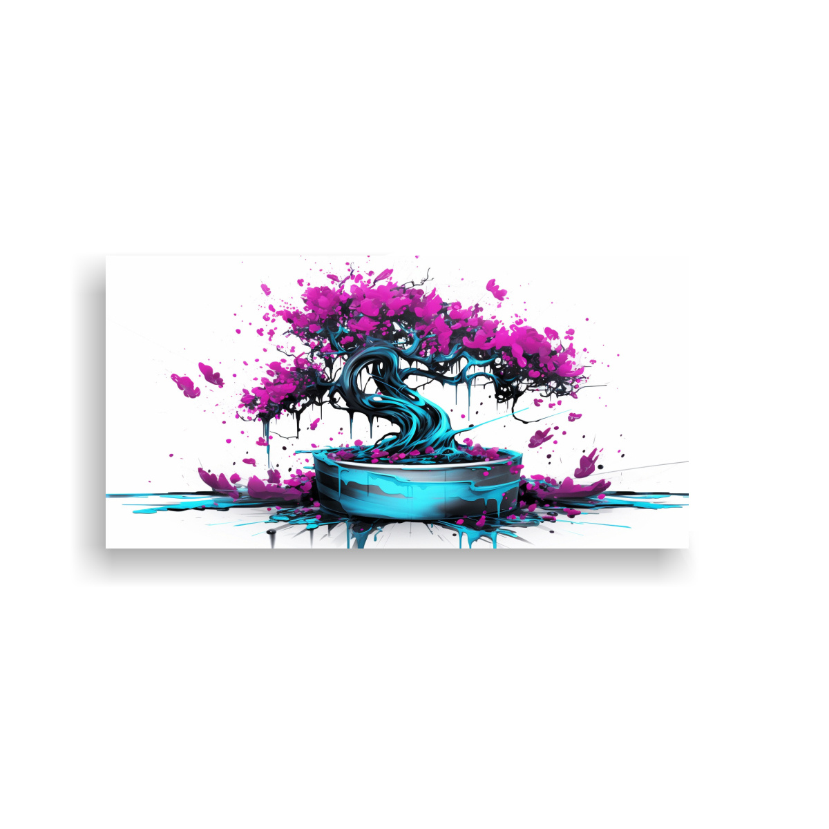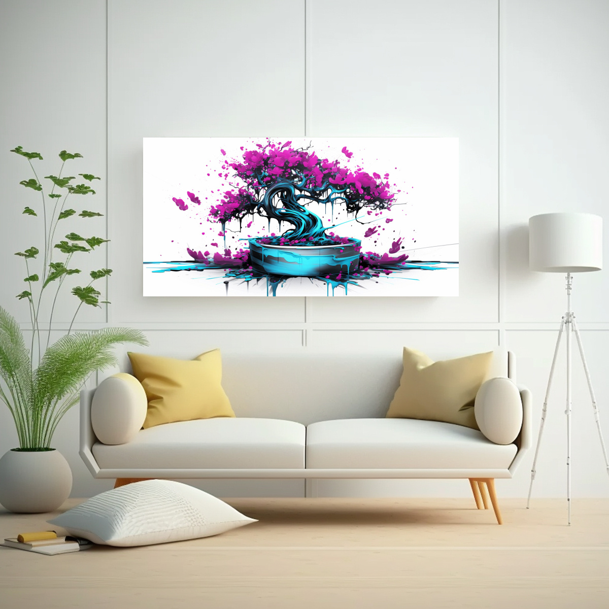 Cuadro Abstracto En Colores Fucsia, Bonsái Turquesa Y Púrpura, Estilo Neonoir Y Resistente.