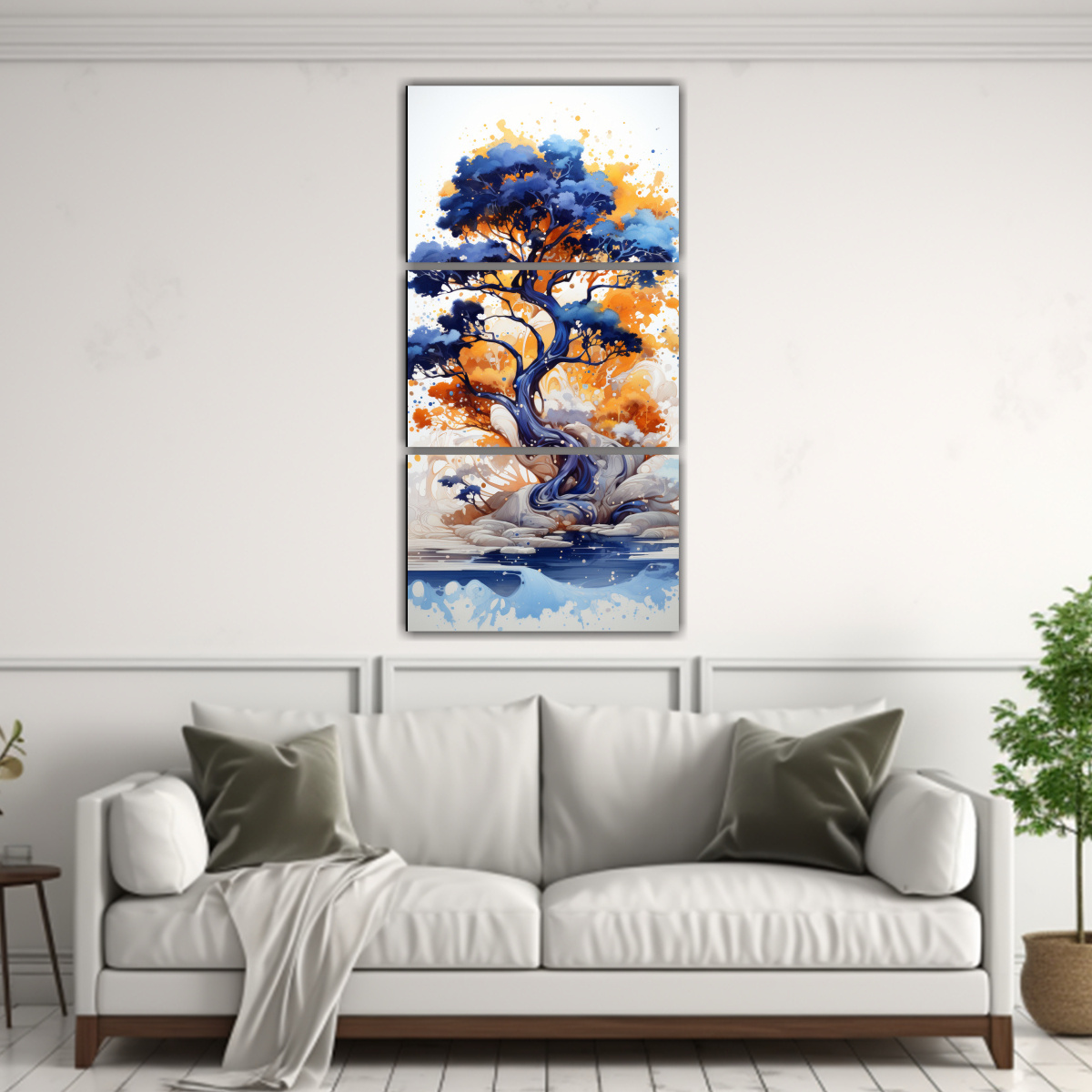 Este cuadro abstracto en colores oro y azul de un árbol de enebro quedará perfecto en tu sala de estar sobre un sofá gris claro para resaltar los tonos azules y dorados ¡Aporta elegancia y estilo a tu espacio!
