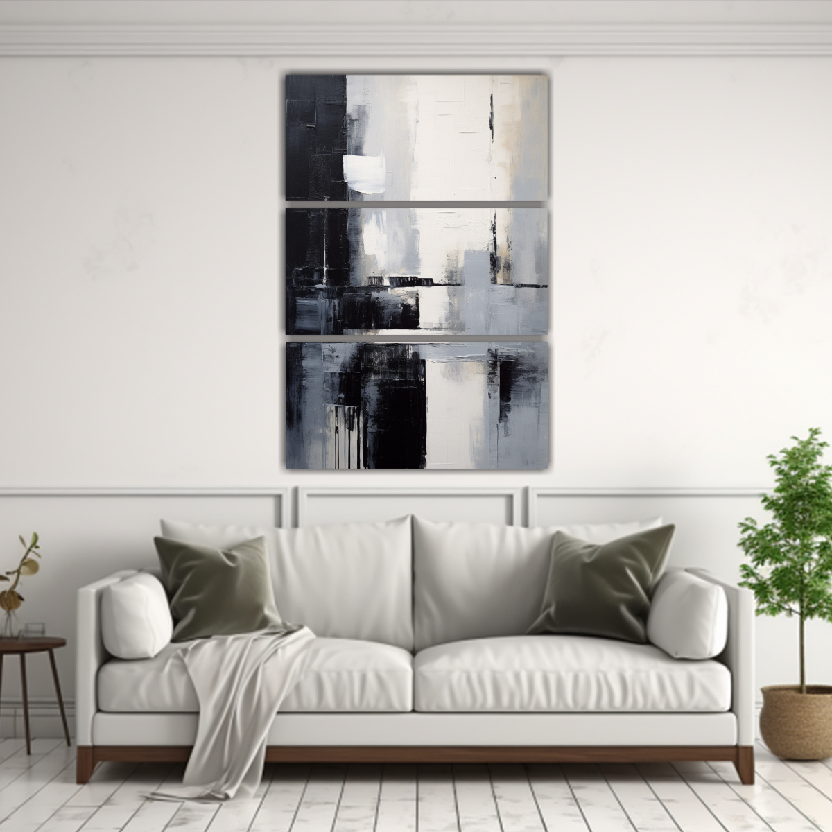 Este cuadro abstracto en gris oscuro y blanco con vitalidad y composición minimalista es perfecto para decorar una sala de estar moderna Puedes colocarlo sobre un sofá de color blanco o gris claro para crear un contraste elegante Además, puedes combinarlo con cojines en tonos azules y plateados para resaltar los colores del cuadro ¡Será el centro de atención en tu espacio!