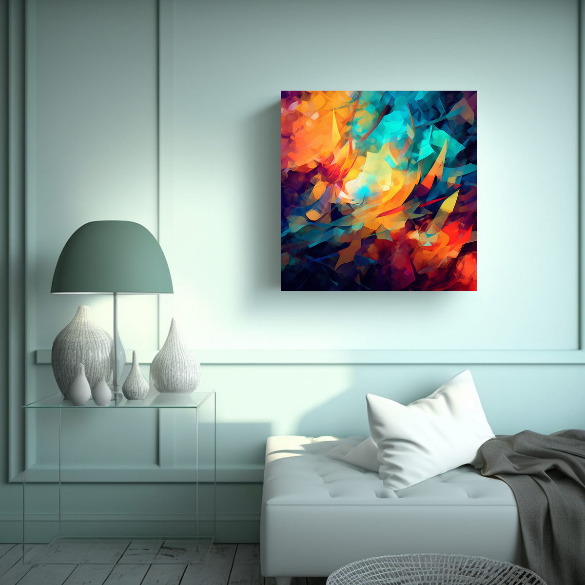 Este cuadro abstracto en tela sublimada con colores vivos es perfecto para decorar tu sala de estar o el dormitorio principal Combina a la perfección con muebles en tonos neutros como beige o gris, agregando un toque de color y vida a tu espacio Colócalo sobre una pared de color blanco para que resalte aún más y crea un ambiente moderno y sofisticado