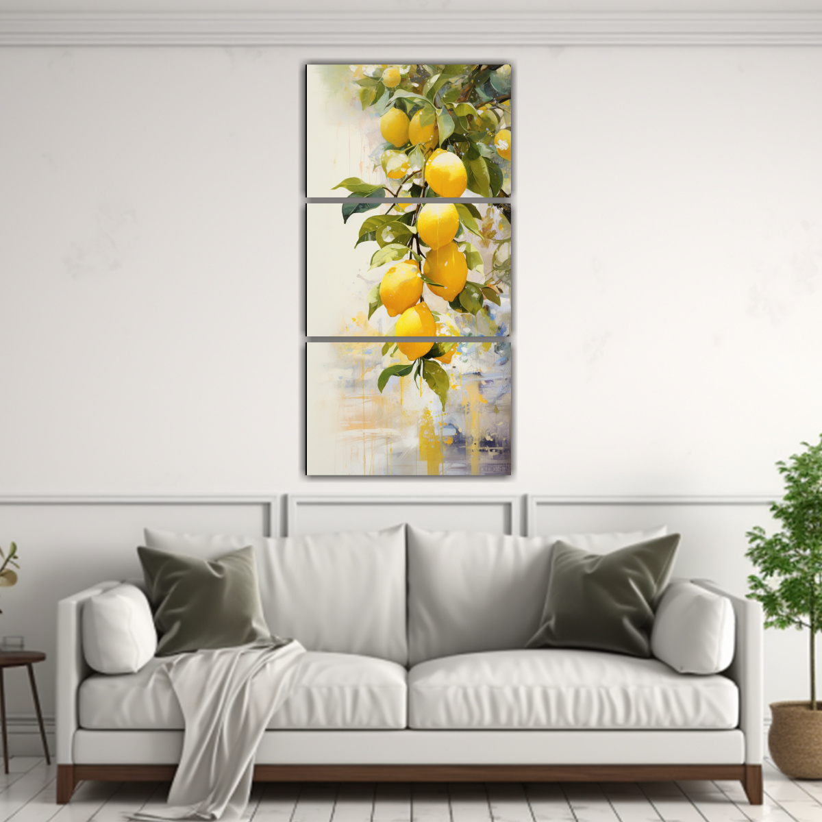Este cuadro abstracto Equilibrio árbol limón blanco y dorado en 3 telas se vería espectacular colocado sobre un sofá de color neutro, como blanco o beige, resaltando así los tonos mostaza, azul marino y turquesa Combínalo con cojines en tonos plateados y grises para lograr una decoración armoniosa y elegante