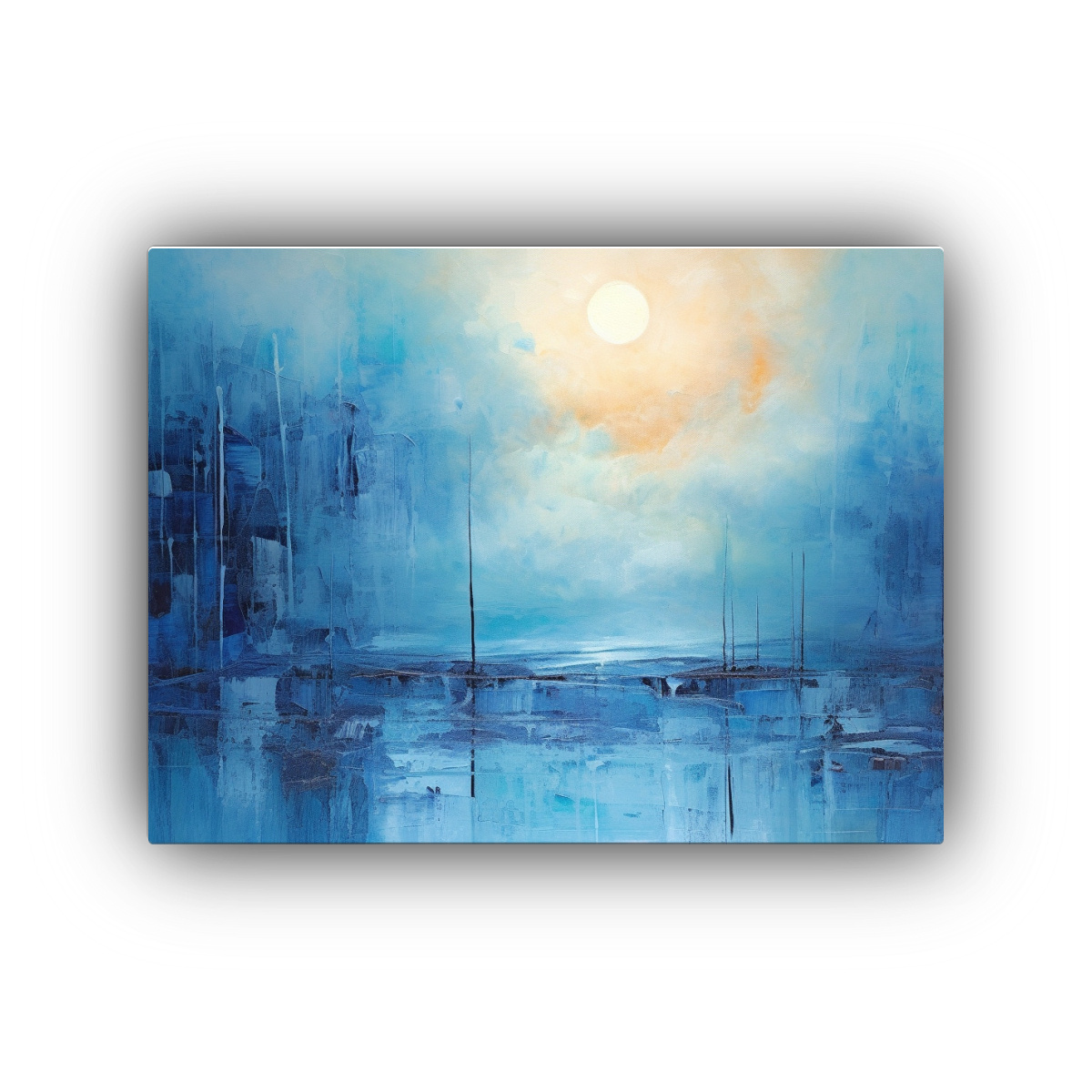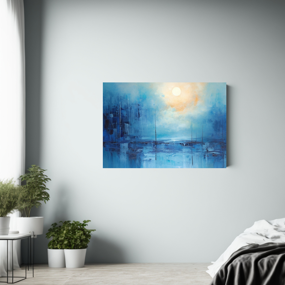 Coloca el Cuadro abstracto Equilibrio azul en tu sala de estar para crear un ambiente moderno y sofisticado Combina con muebles blancos y detalles en tonos plateados para resaltar su belleza y lograr un equilibrio perfecto en la decoración
