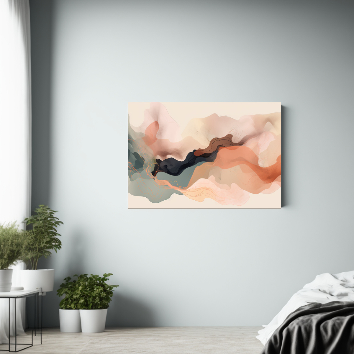 Este cuadro abstracto en tonos suaves es perfecto para colocar en el área de la sala de estar, creando un punto focal que aporte calidez y elegancia Combínalo con muebles de tonos neutros para resaltar su belleza y crear un ambiente moderno y sofisticado