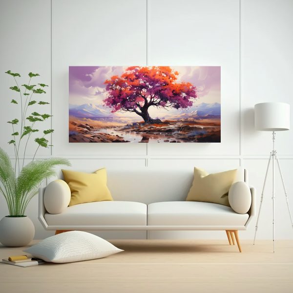 Este cuadro abstracto de olivo en morado y naranja es ideal para destacar en la sala de estar sobre un sofá beige, creando un contraste elegante Complementa con cojines en tonos coral y plateado para una decoración moderna y sofisticada