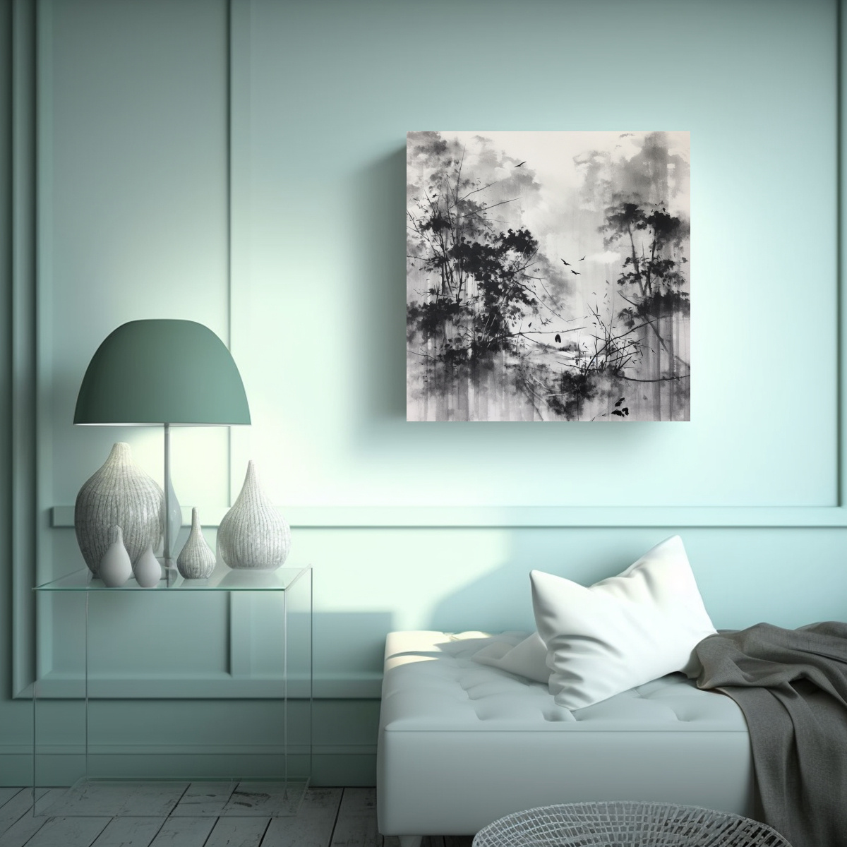 Este cuadro sería ideal para decorar una sala de estar moderna Puedes colocarlo sobre un sofá de color neutro y combinarlo con cojines en tonos plateados, azules y grises También puedes añadir elementos decorativos en cristal para resaltar su encanto ¡Sorprende a tus invitados con esta obra de arte única!