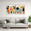 Este cuadro abstracto geométrico colorido con triángulos y círculos es perfecto para darle vida a tu sala de estar Colócalo sobre un sofá en tonos neutros para crear un contraste llamativo y moderno Combina el cuadro con cojines en colores similares para lograr una decoración armoniosa