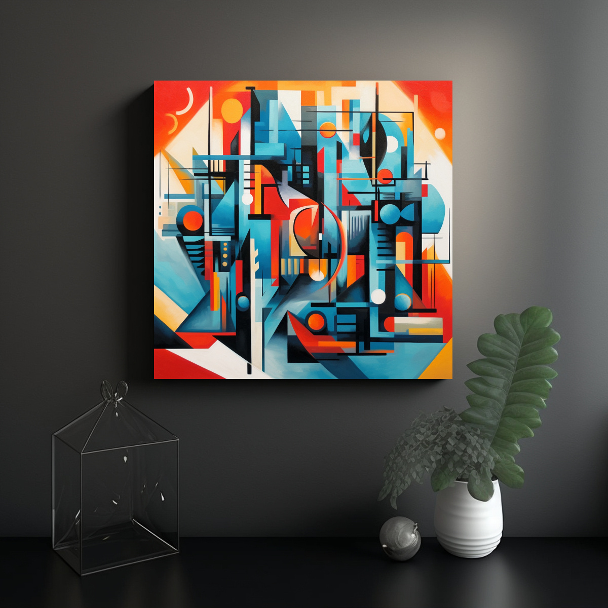 Para realzar la energía y vitalidad de tu sala, coloca este cuadro abstracto geométrico cerca de una fuente de luz natural, como una ventana amplia Combínalo con muebles en tonos neutros para que los colores vibrantes resalten aún más en el ambiente