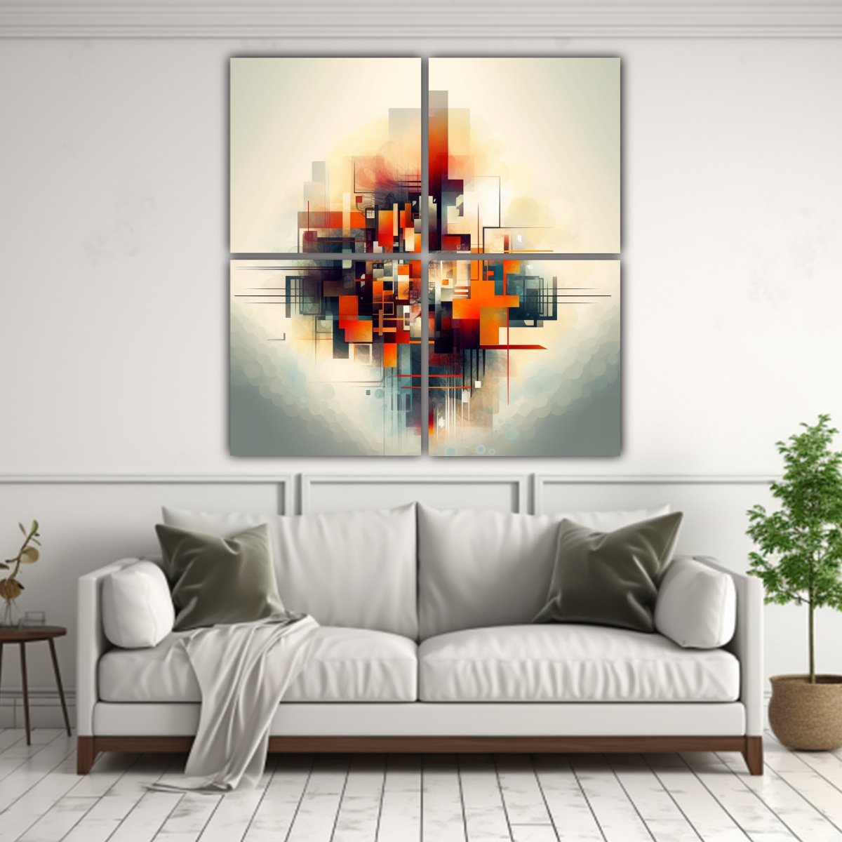 Este cuadro Abstracto Geométrico Cuatro Canvas Cuadrado se vería espectacular colocado en el salón principal de tu hogar Combínalo con muebles modernos y minimalistas en tonos neutros como blanco y gris, para resaltar los colores vibrantes del cuadro Colócalo en una pared libre de distracciones y permite que sea el centro de atención Te garantizamos que esta combinación creará un ambiente sofisticado y lleno de estilo en tu casa