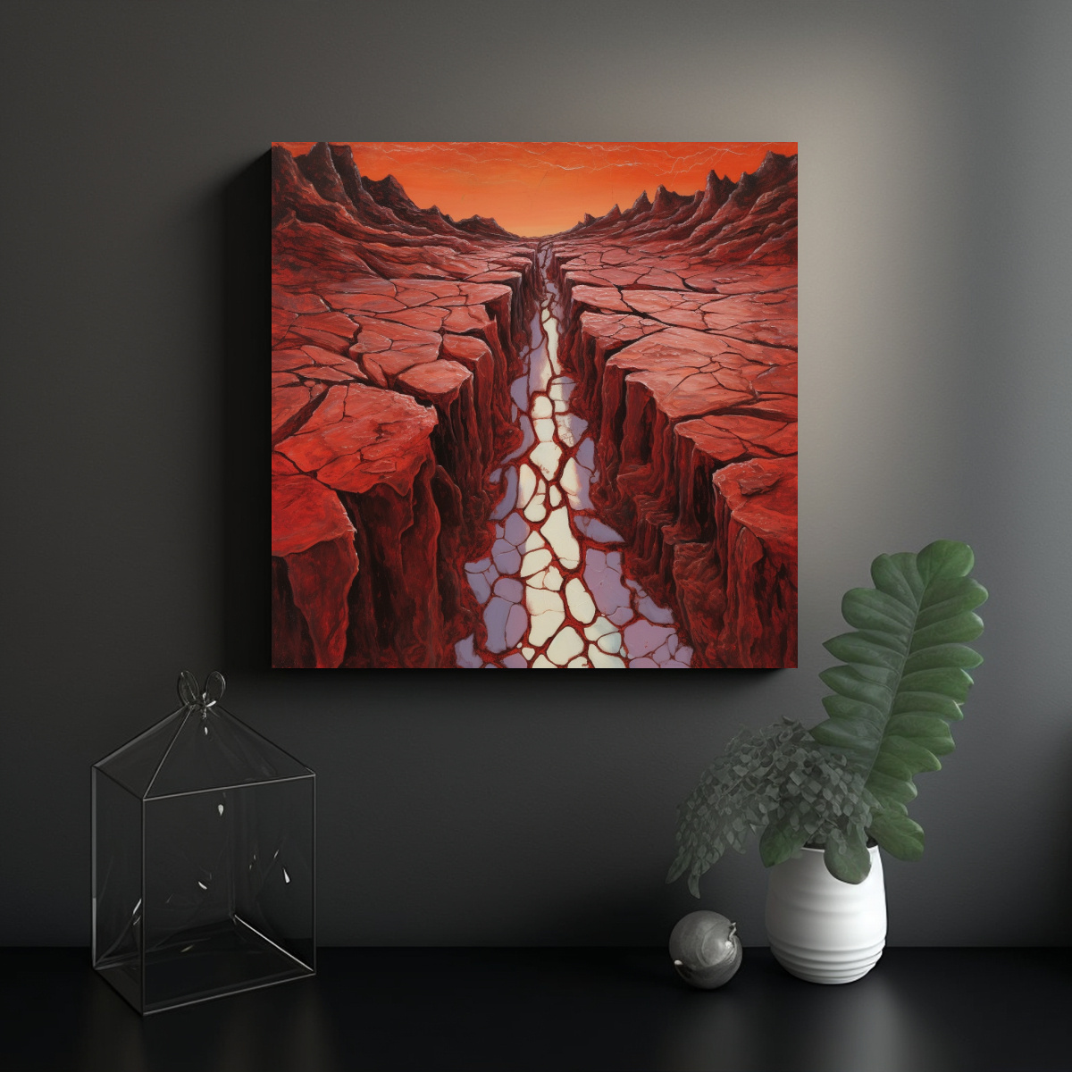 Este Cuadro Abstracto: Grieta profunda en suelo rojo sería ideal para decorar la sala de estar, creando un punto focal de atención Combínalo con muebles en tonos neutros para resaltar su elegancia y modernidad ¡Dale un toque de sofisticación a tu hogar con este cuadro exclusivo!