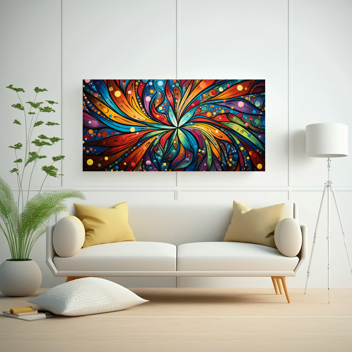 Este cuadro abstracto inspirador de vida con patrones vibrantes y alegres se vería espectacular en una sala de estar moderna Colócalo sobre un sofá blanco o gris para crear un contraste llamativo Combínalo con cojines en tonos coral, menta y lila para lograr una armonía cromática ¡Atrévete a darle vida a tu hogar con este cuadro de DecoCuadros!