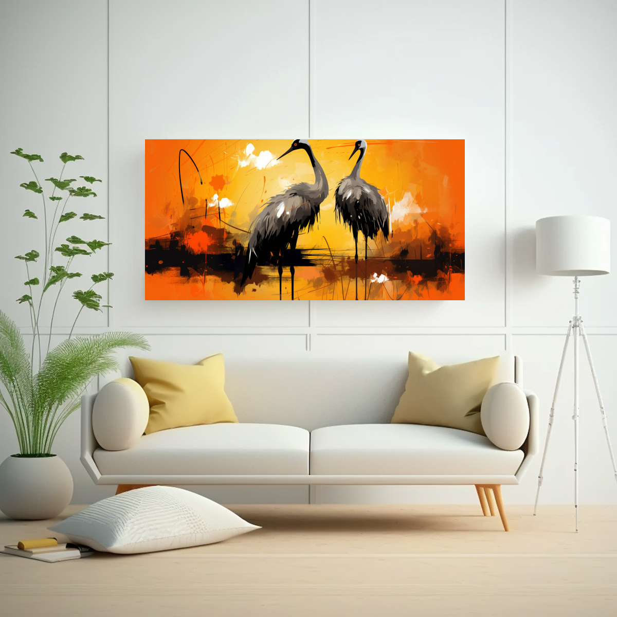 Este cuadro abstracto con grullas en tonalidades naranjas sería ideal para decorar un espacio amplio y luminoso, como la sala de estar Combínalo con muebles en tonos neutros para resaltar su intensidad y darle un toque moderno y elegante a tu hogar