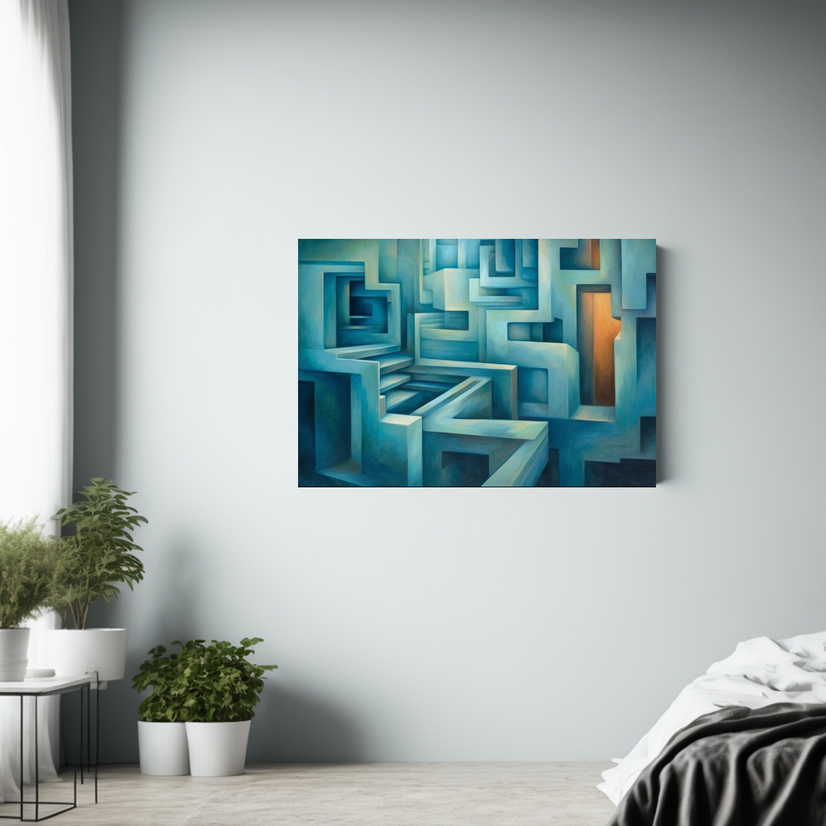 Este Cuadro Abstracto Laberíntico Color Intenso se vería espectacular en la sala de estar sobre un sofá de color neutro, creando un contraste sofisticado y llamativo También puedes colocarlo en un pasillo amplio para darle profundidad y estilo