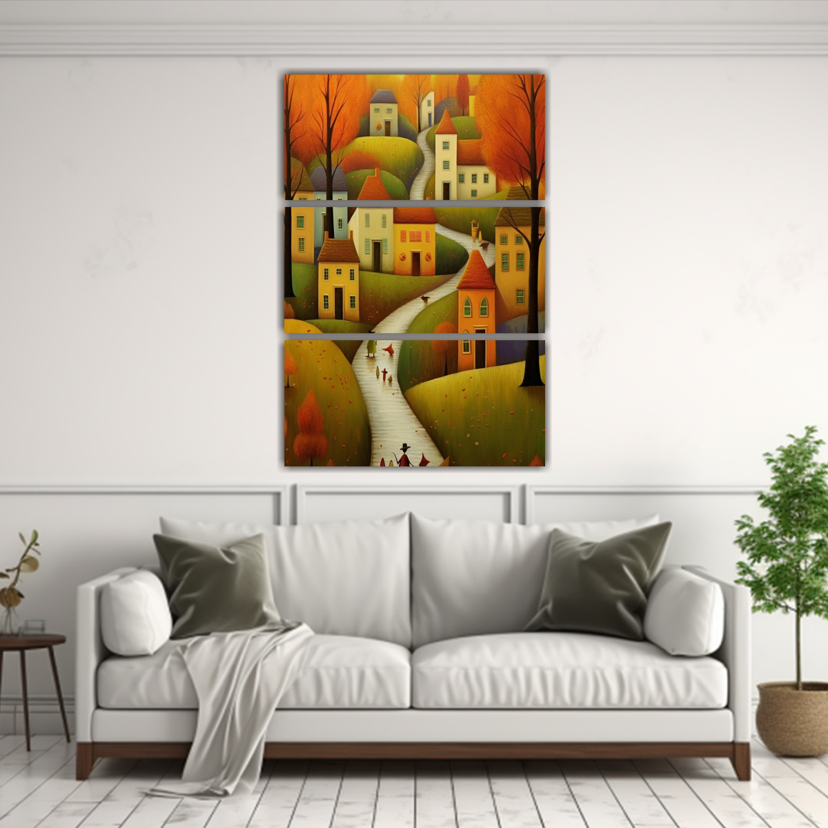 Cuadro Abstracto Minimalista Estilo Iwona Lif, Aldea Otoñal En Europa, Juego De 3 Lienzos