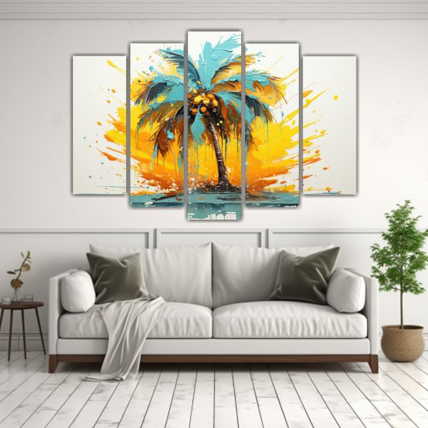 Coloca el cuadro del árbol de palma en tonos amarillo y turquesa en tu sala de estar para crear un ambiente fresco y tropical Combínalo con muebles blancos y plantas verdes para una decoración moderna y relajante