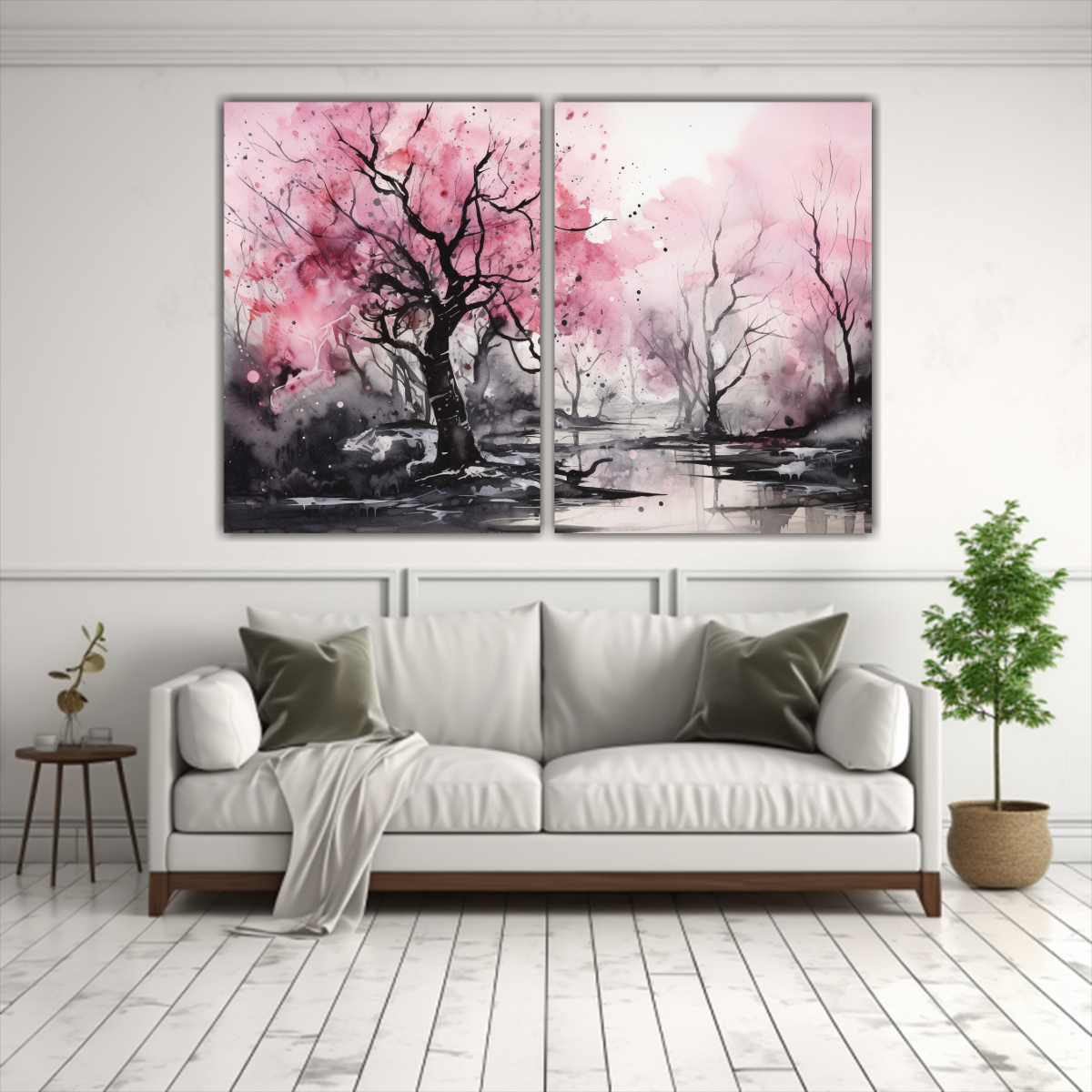 Renueva tu espacio con este moderno cuadro abstracto que combina árboles frutales en tonos negros y rosas Aporta sofisticación y estilo a tu sala de estar, dormitorio o estudio La mejor calidad y entregas rápidas en DecoCuadros