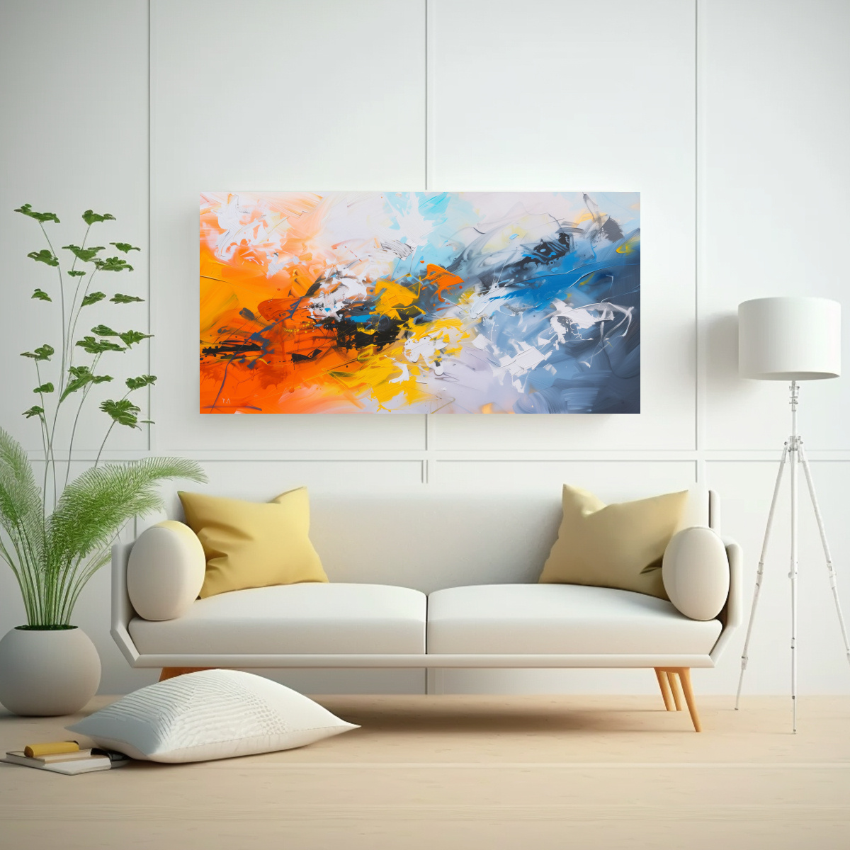 Este cuadro abstracto moderno en azul y naranja sería ideal para colocar en el salón principal, creando un punto focal impactante Combínalo con muebles en tonos neutros para resaltar su belleza y añadir un toque de color a la decoración de tu sala de estar
