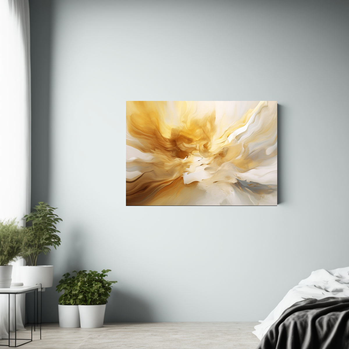 Añade un toque de elegancia a tu sala de estar, comedor o dormitorio con este cuadro abstracto en tonos dorados y blancos Combina perfectamente con muebles en tonos neutros, beige o gris para crear un ambiente sofisticado y moderno