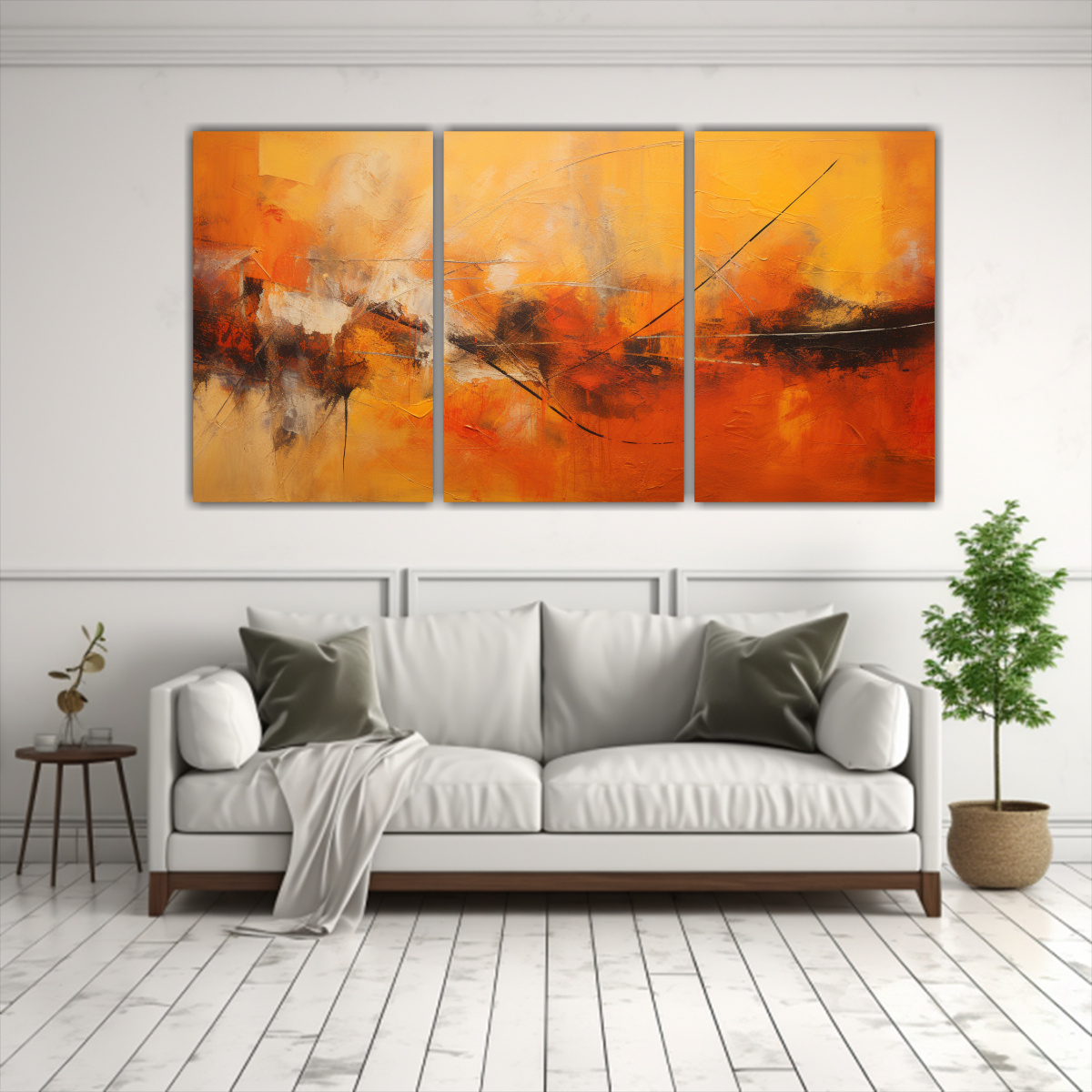 Este cuadro abstracto moderno Tres lienzos tierra en colores Coral, Carmesi, Azul Marino grisaceo, Plateado, Chocolate y Dorado sería perfecto para decorar tu sala de estar o tu habitación Combínalo con muebles en tonos neutros como blanco o beige para resaltar su belleza y crear un ambiente elegante y sofisticado