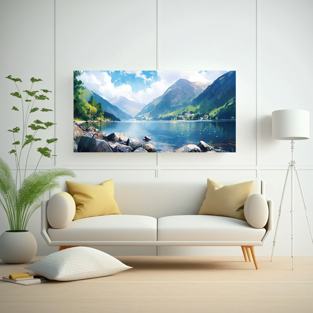 Para realzar la belleza del Cuadro Abstracto Montañas Lacustres con Colores Blancos, te recomendamos colocarlo en una pared blanca para que los colores resalten y se convierta en el centro de atención de la habitación Puedes complementar la decoración con plantas verdes para crear un ambiente fresco y armonioso