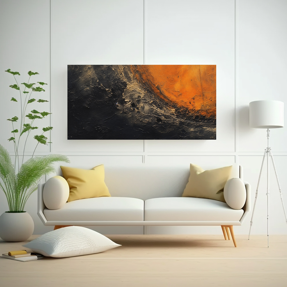 Para realzar la belleza de este cuadro abstracto negro y naranja, te recomendamos colocarlo en una pared blanca para que resalten los colores Complementa la decoración con muebles en tonos neutros y algunos detalles en plateado para lograr un espacio armonioso y contemporáneo