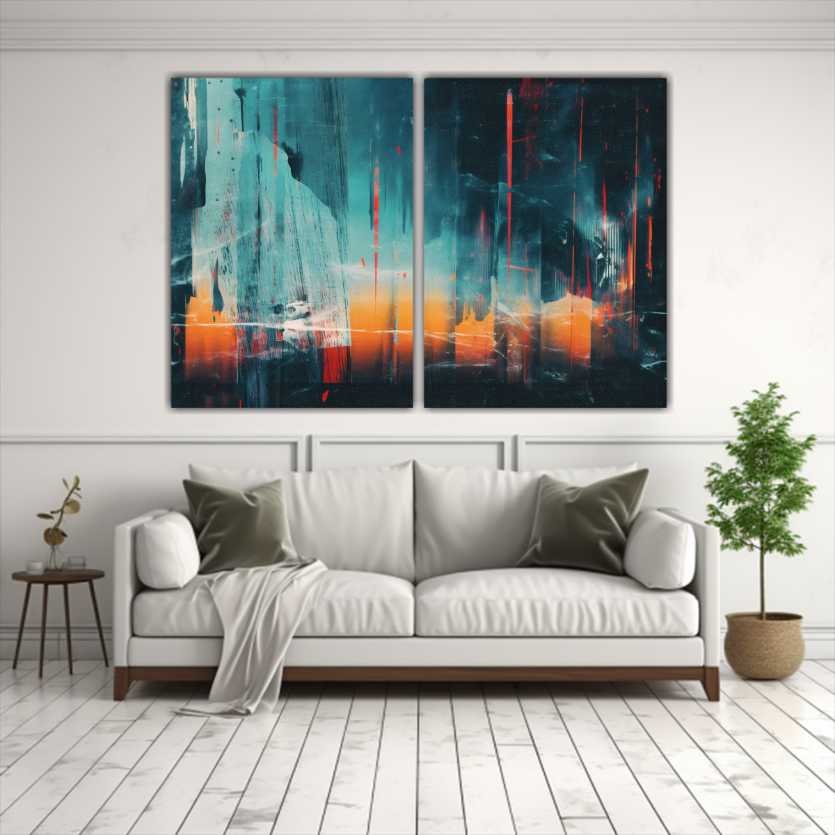 Coloca este díptico abstracto en tu sala de estar sobre un sofá blanco para resaltar su belleza y crear un ambiente sofisticado Complementa con cojines en tonos turquesa y coral para un look armonioso