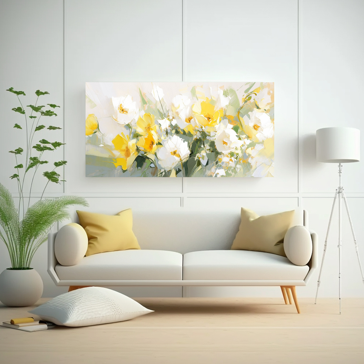 Este Cuadro Abstracto Flores Amarillas y Blancas en Lienzo es perfecto para decorar tu sala de estar Puedes colocarlo sobre un sofá de color neutro para resaltar su belleza y agregar calidez al ambiente Además, combina muy bien con muebles de madera oscura y accesorios dorados o plateados Si deseas crear un ambiente más sofisticado, puedes incluir cojines en tonos beige y gris, así como cortinas en azul marino ¡Atrévete a darle vida a tu sala con este hermoso cuadro!