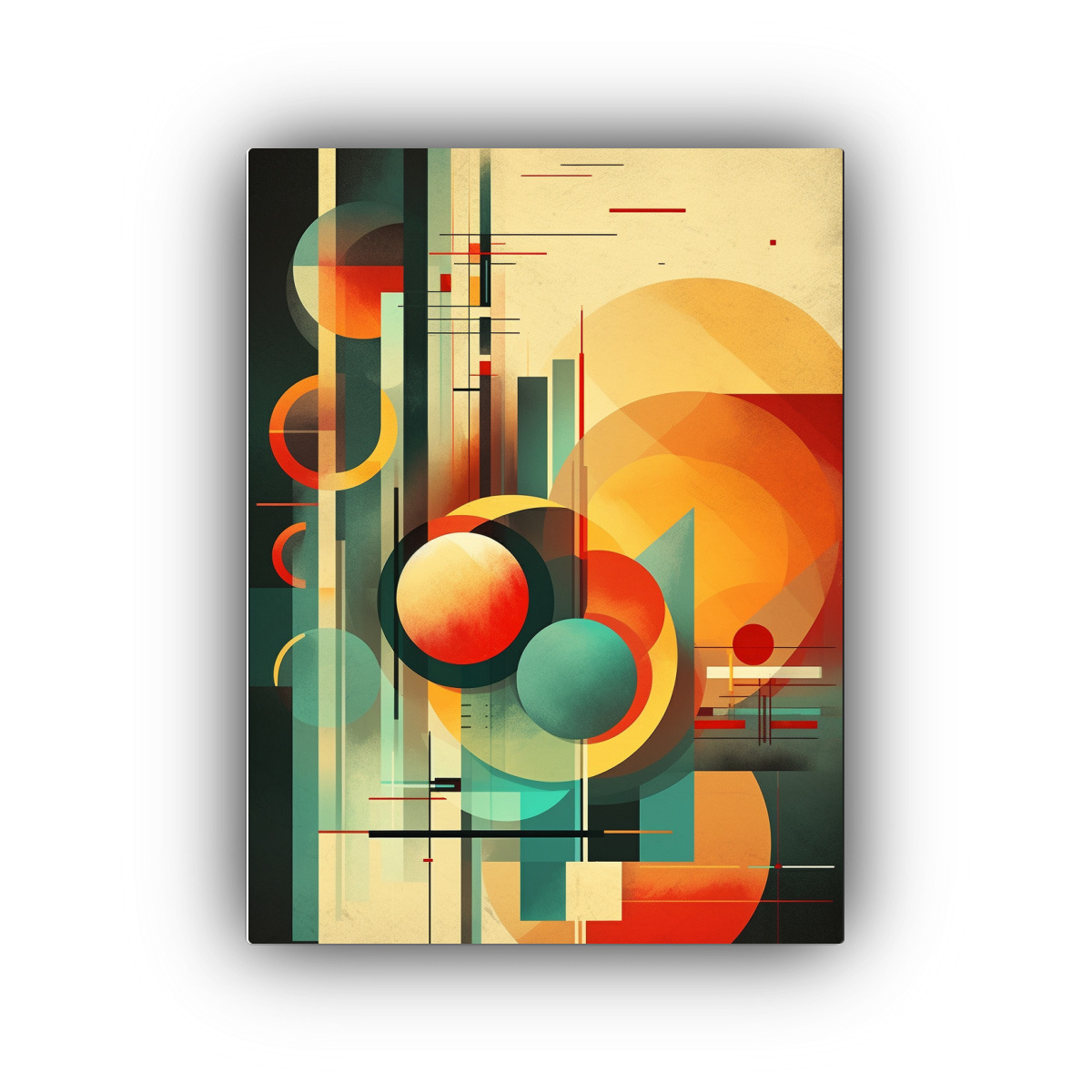 Este cuadro abstracto retro futurista de colores brillantes y vibrantes sería perfecto para decorar una sala de estar moderna Colócalo sobre un sofá de color neutro para crear un contraste llamativo Combínalo con cojines en tonos coral y gris, y agrega lámparas de mesa en amarillo claro y menta Así, lograrás un ambiente fresco y lleno de energía
