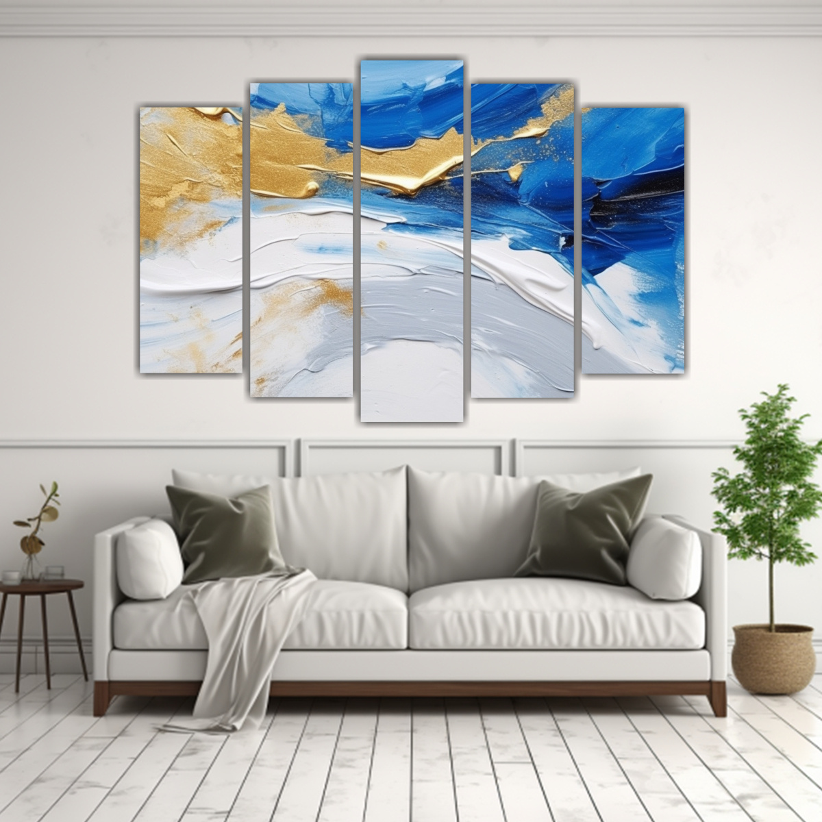 Renueva tu espacio con este Cuadro abstracto en tonos azul blanco y dorados, ideal para dar un toque de elegancia y sofisticación Perfecto para salas de estar, dormitorios o incluso oficinas Combínalo con muebles en tonos neutros para resaltar su belleza y crear un ambiente armonioso