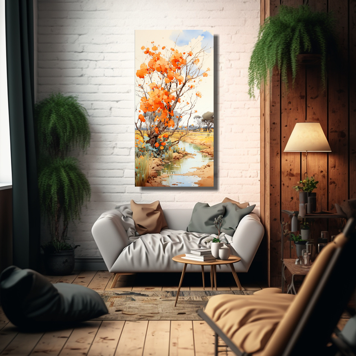 Este cuadro abstracto tonos brillantes árbol de eucalipto naranja y negro sería ideal para decorar una sala de estar moderna Puede colocarse sobre un sofá o una chimenea para agregar un toque de color y estilo Combínalo con cojines en tonos neutros y elementos decorativos en plateado para crear una atmósfera elegante y sofisticada