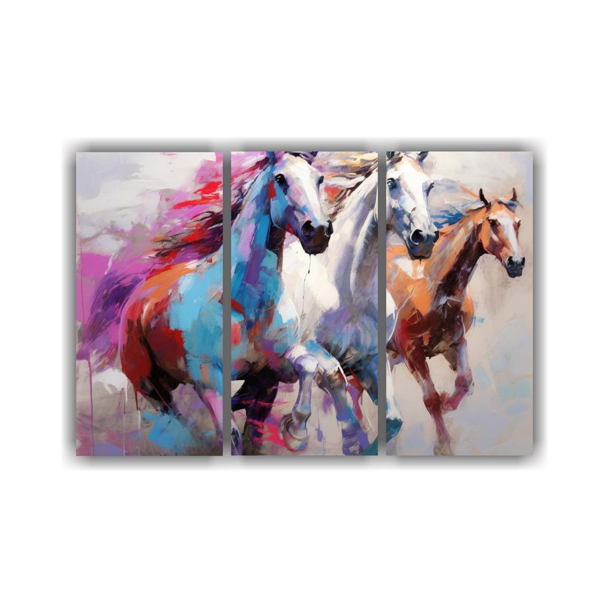 Renueva tu espacio con este impresionante cuadro abstracto de tres caballos en movimiento Los colores vibrantes y la elegancia de la composición le darán un toque único a tu decoración Aprovecha la mejor calidad y precios accesibles en DecoCuadros