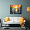 Este cuadro abstracto vibrante de ciudad con patrones geométricos sería perfecto para colocar en la sala de estar sobre un sofá de color neutro para resaltar sus tonos vivos y agregar un toque moderno y elegante a tu espacio Combínalo con cojines en tonos similares para lograr una decoración armoniosa