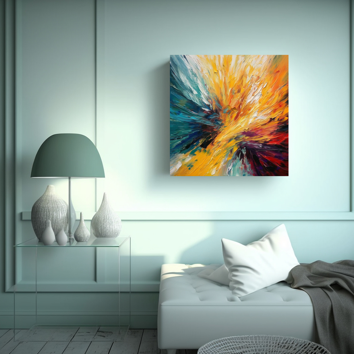 Este cuadro es perfecto para decorar tu sala de estar o tu dormitorio Combina muy bien con una pared de color neutro, como el blanco o el gris claro, para resaltar sus colores vivos También puedes colocarlo sobre un mueble oscuro para crear un contraste interesante ¡Dale vida y alegría a tus espacios con este cuadro abstracto!