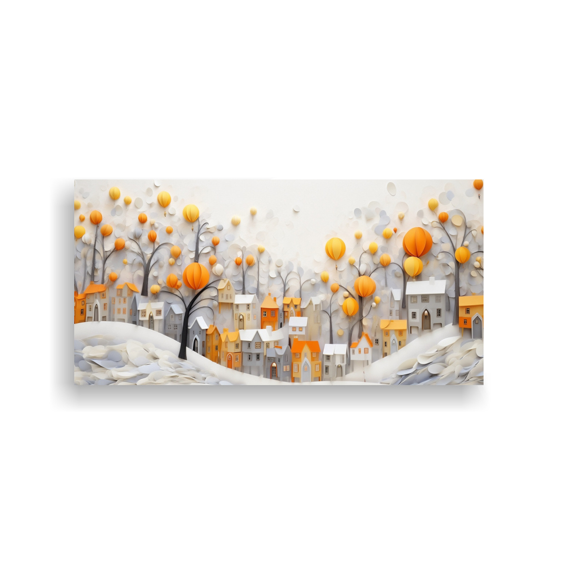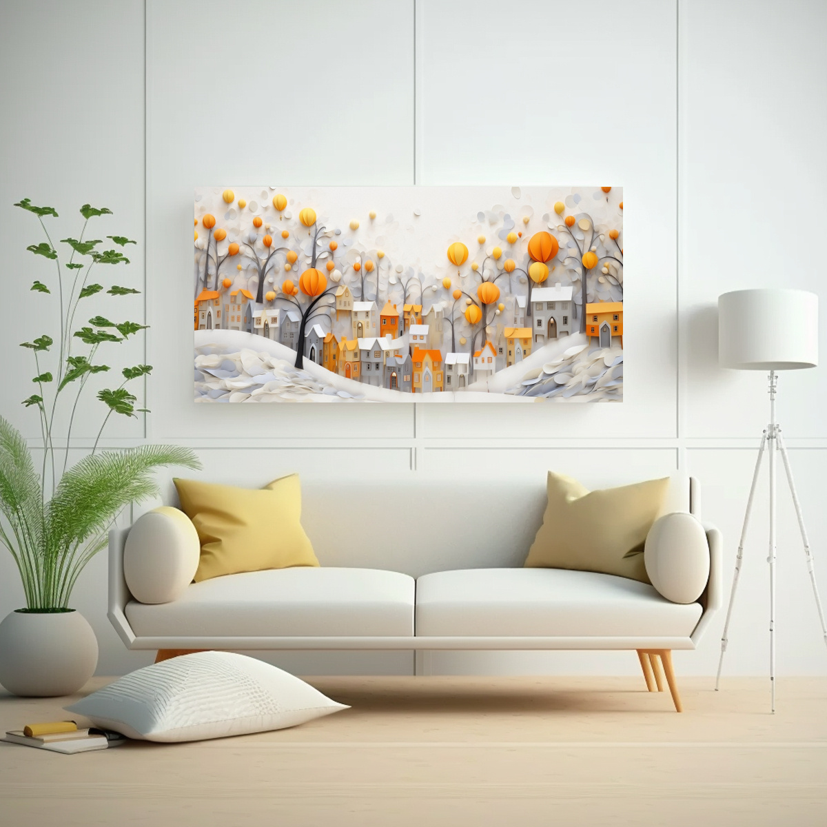 Para realzar la belleza de este cuadro acuarela, te recomiendo colocarlo en la sala de estar sobre un sofá de tonos neutros para que los colores de las casas y árboles resalten y se convierta en el centro de atención de la habitación