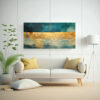 Este cuadro acuarela Detalles vibrantes en color turquesa y dorado es ideal para decorar el salón de tu casa Puedes colocarlo sobre la pared principal del sofá, creando así un punto focal en la habitación Combínalo con cojines en tonos azules y dorados para complementar la paleta de colores del cuadro También puedes agregar algunas velas en tonos turquesa y dorado para crear un ambiente cálido y acogedor ¡Con este cuadro, transformarás tu salón en un espacio elegante y sofisticado!