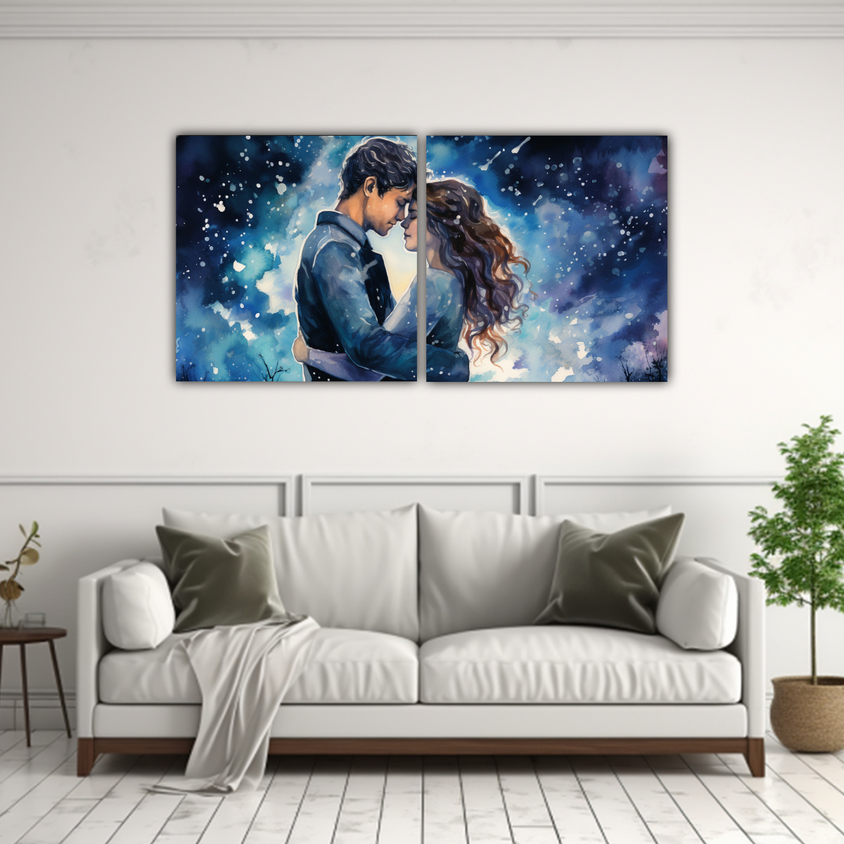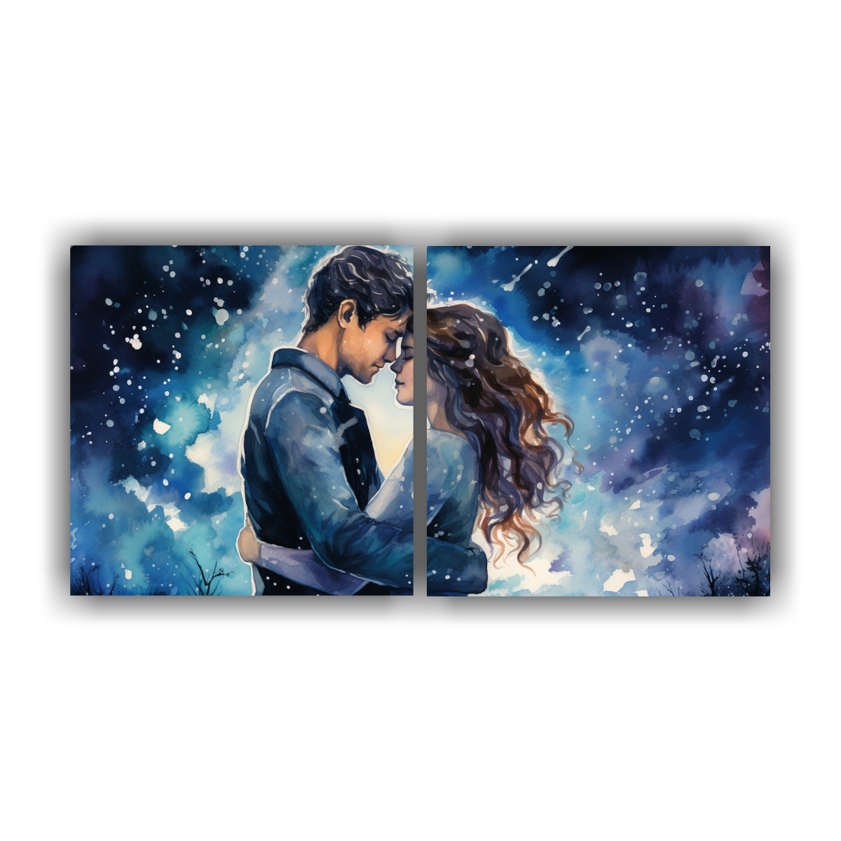 Este cuadro acuarela Dos Telas en Bastidor Cálidos Únicos la noche que nos conocimos es perfecto para colocarlo como punto focal en tu sala de estar o dormitorio Combina a la perfección con paredes en tonos neutros como el blanco o el gris claro, resaltando aún más su diseño único También puedes colocarlo sobre una repisa o estantería junto a elementos decorativos en tonos plateados, dorados y turquesa ¡Crea un ambiente cálido y sofisticado en tu hogar!