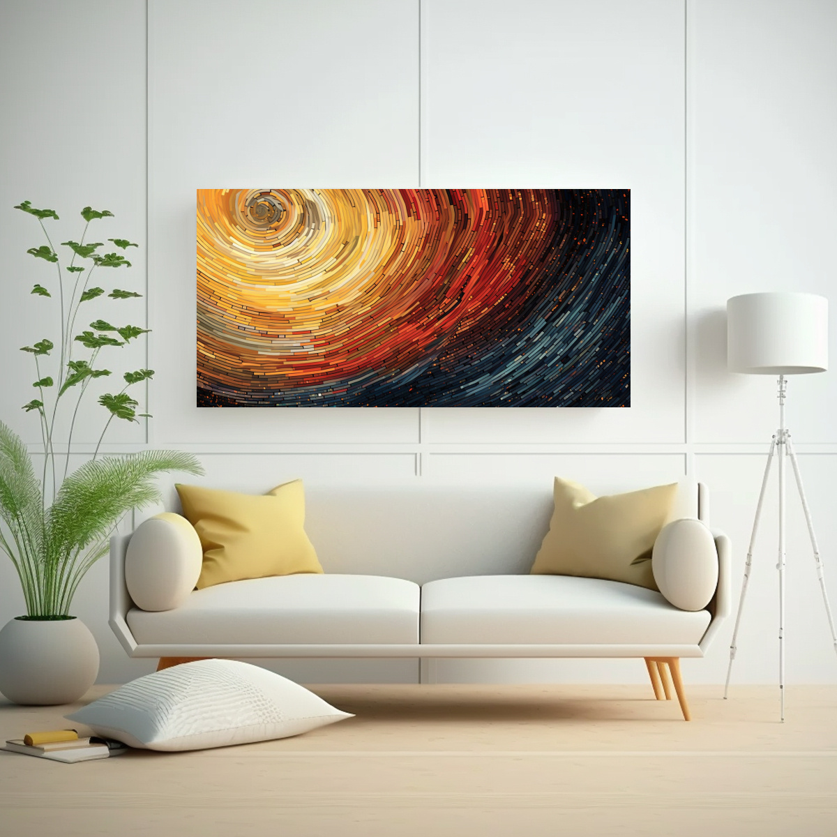 Para realzar su belleza, coloca este cuadro acuarela Espacio 31 en una pared de tonos neutros como blanco o beige, creando contraste y destacando sus colores vibrantes Combínalo con muebles en tonos cálidos para un ambiente acogedor y contemporáneo