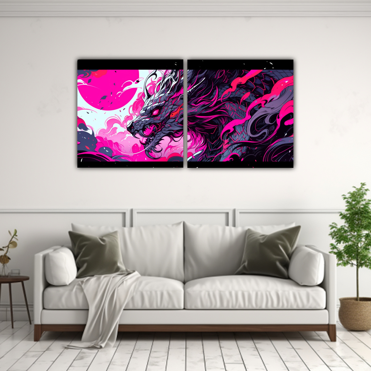 Coloca este Cuadro de Dragón en colores vibrantes y rosa en una pared de tonos neutros como blanco o gris para que resalte y sea el punto focal de la habitación Combínalo con elementos decorativos en tonos grises y rosados para lograr un ambiente armonioso y moderno