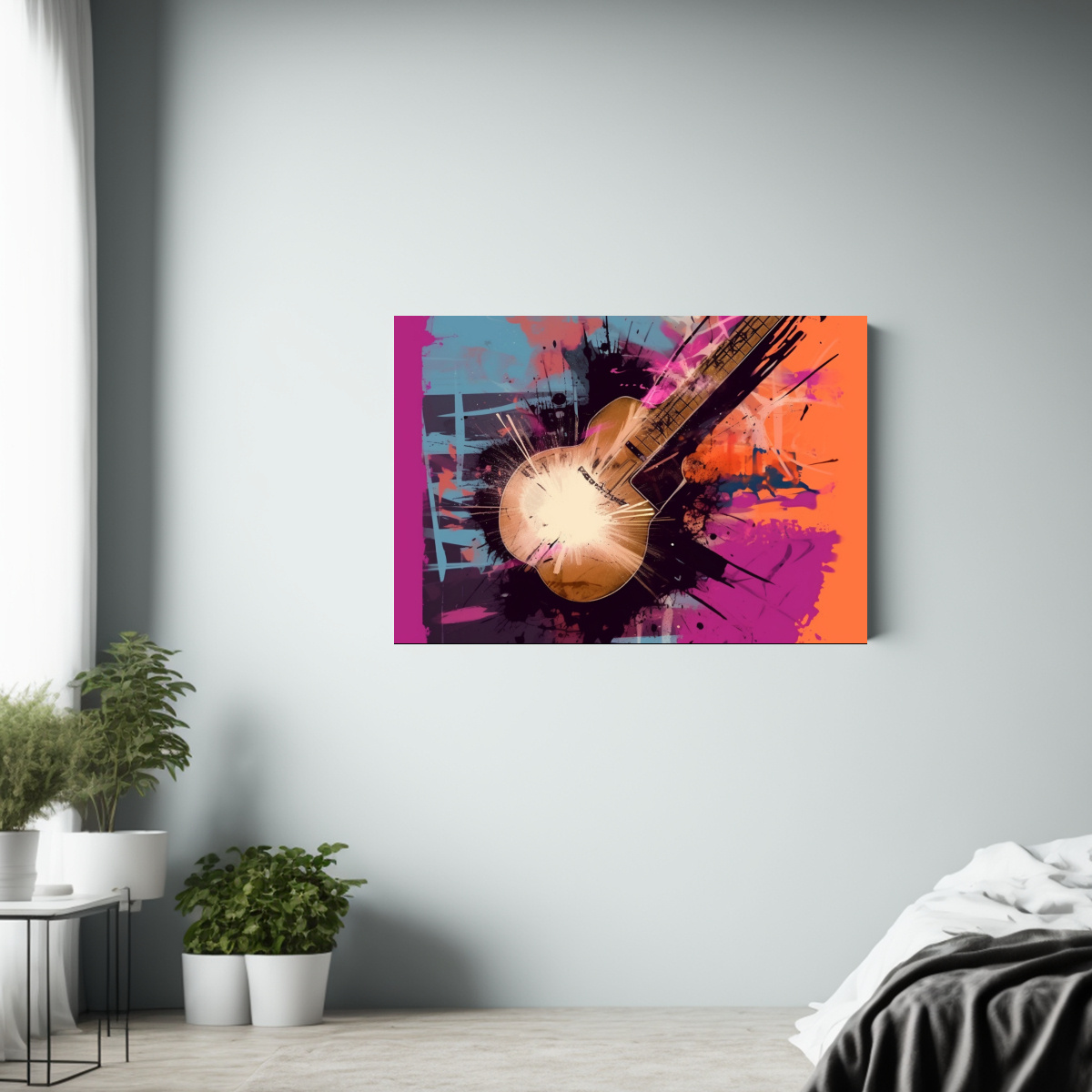 Coloca este cuadro acuarela en tu dormitorio, justo encima de tu colección de vinilos de música metal, para crear un rincón temático que refleje tu pasión por la rebeldía y la innovación Combínalo con luces tenues para resaltar su diseño y crear un ambiente acogedor y original