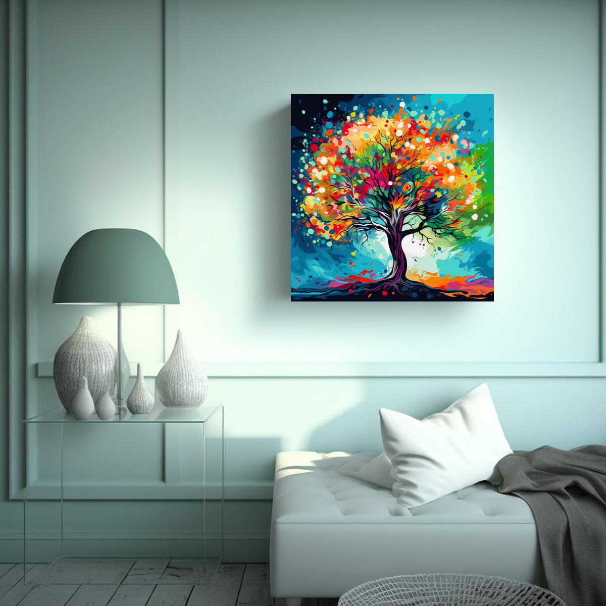 Este cuadro acuarela Simetría Árbol de Mango en Colores del Arco Iris se verá espectacular en tu sala de estar Colócalo sobre un mueble en tonos neutros, como un sofá beige o gris, para que resalte aún más Combínalo con cojines en colores similares para crear una atmósfera armoniosa y acogedora