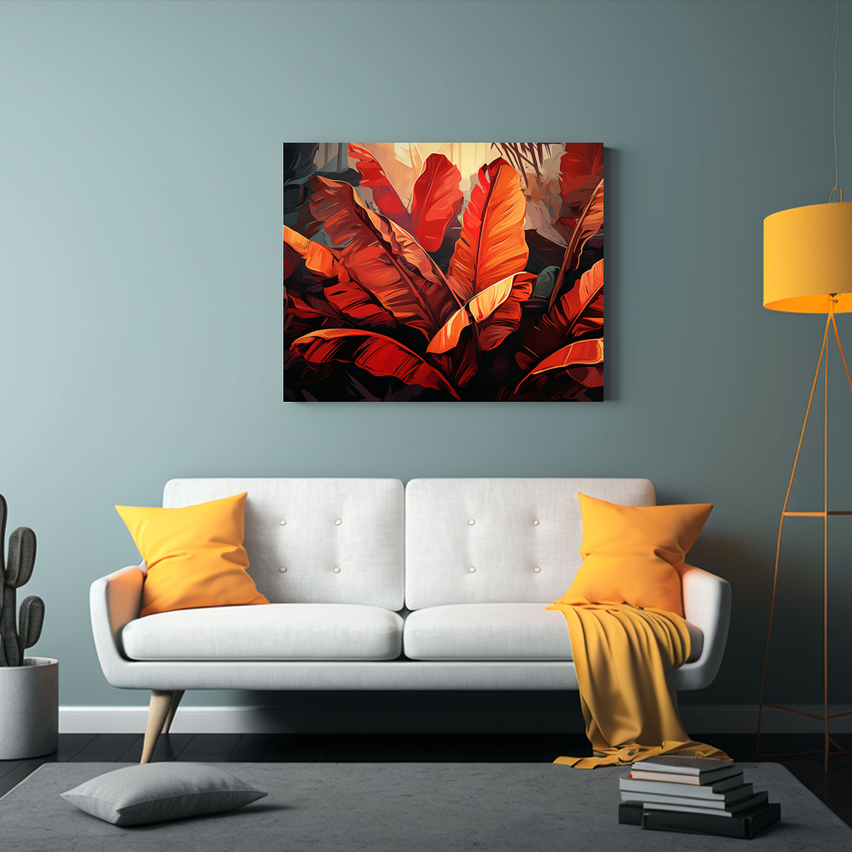 Este cuadro brillante de hojas de plátano en rojo y naranja se vería espectacular en el salón principal de tu hogar, combinando a la perfección con muebles de tonos neutros para resaltar su diseño neonoir ¡Atrévete a darle vida a tus paredes!