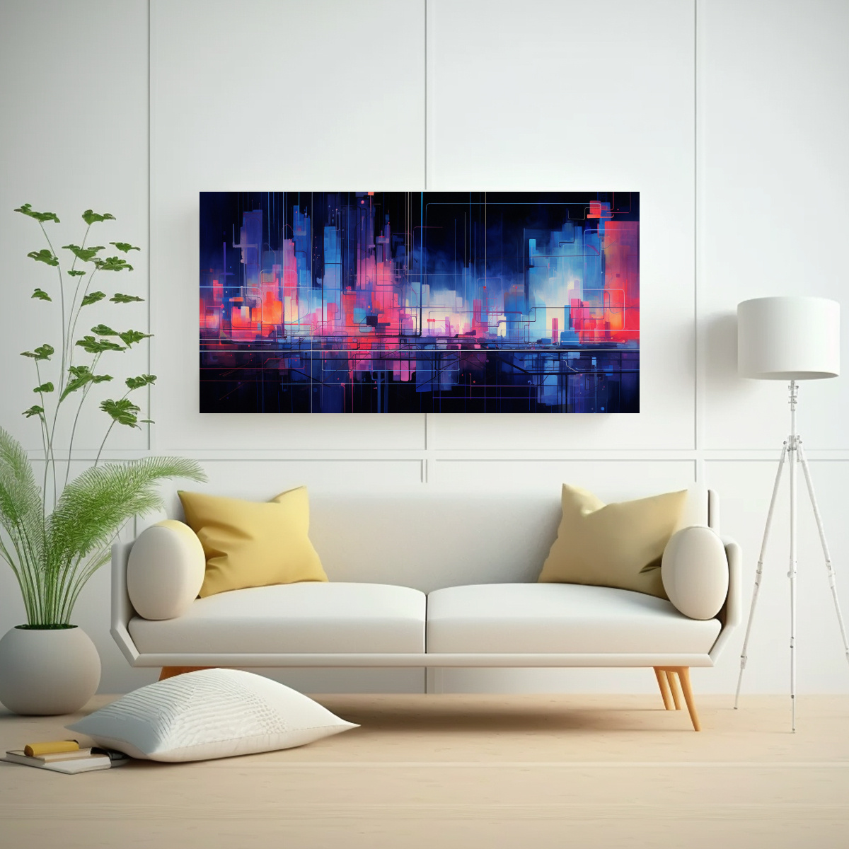 Este cuadro es perfecto para decorar un salón de estar moderno y sofisticado Te recomendamos colocarlo sobre un mueble de color blanco para resaltar los colores vibrantes del cuadro Además, puedes complementar la decoración con cojines en tonos coral, azul marino grisaceo o lila ¡Crea un ambiente único y elegante con el Cuadro Ciudad Abstracta atardecer en lona de DecoCuadros!