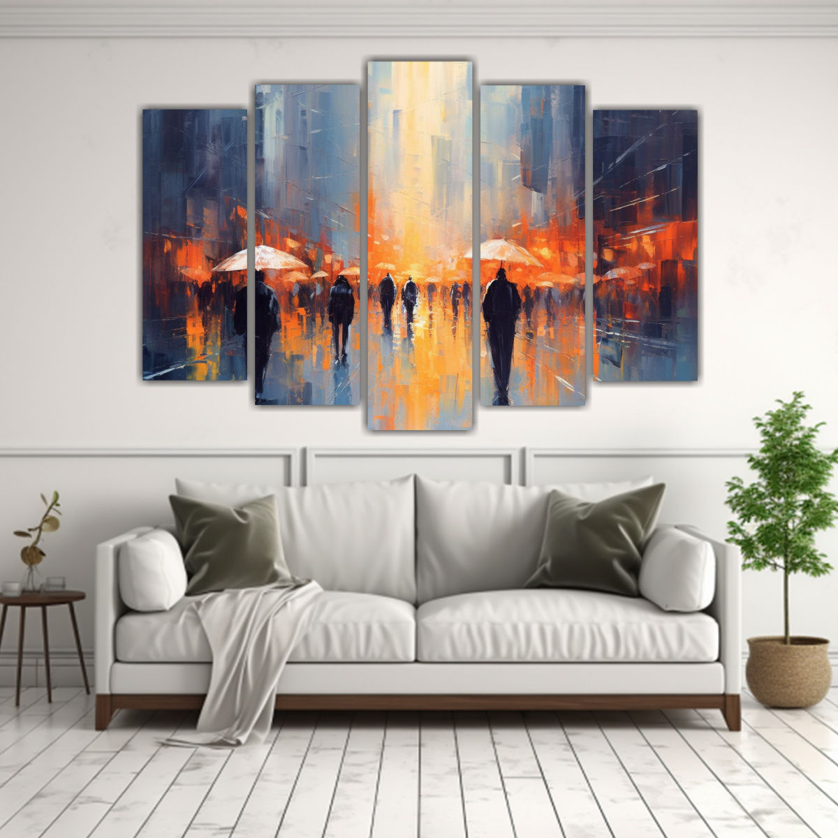 Coloca el Cuadro Ciudad Personas Paraguas en la sala de estar para darle un toque moderno y sofisticado Combínalo con muebles en tonos neutros y detalles en coral para resaltar su belleza y crear un ambiente acogedor