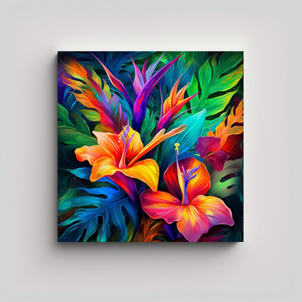 Dale vida a tus espacios con el Cuadro Colorido Tropical Flores K de DecoCuadros Impreso en tela de alta calidad y montado en un bastidor de madera, este cuadro aportará un toque de intensidad y creatividad a tu decoración Nuestros precios son los más económicos del mercado y ofrecemos entregas rápidas y gratuitas en Santiago ¡Aprovecha esta oportunidad para adquirir un diseño exclusivo que llenará de color tu hogar! Colócalo en tu sala de estar, comedor o dormitorio para crear un ambiente vibrante y sofisticado