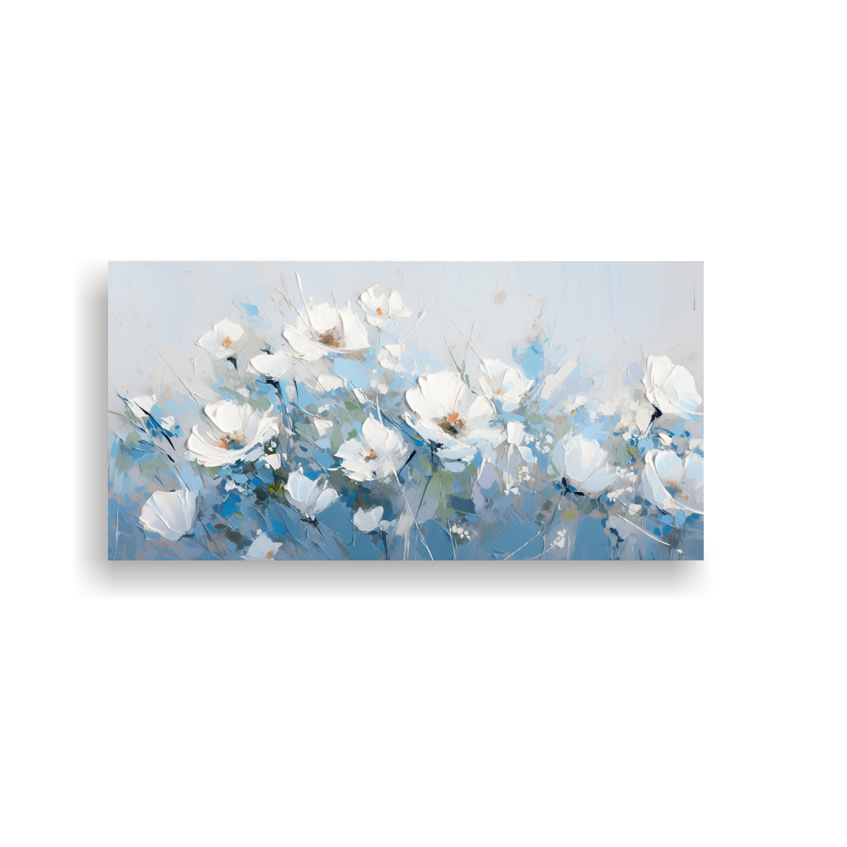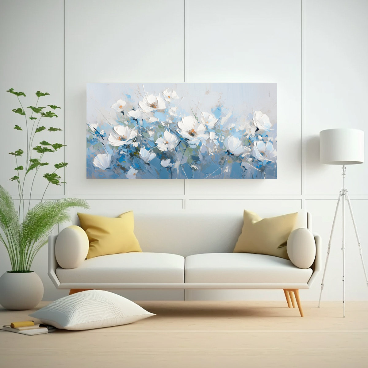 Coloca el Cuadro Composición Único en Lienzo Blanco y Azul con Flores en la Decoración en la sala de tu hogar para darle un toque de elegancia y frescura Combina perfectamente con muebles de tonos claros y accesorios en colores azul o gris Sorprende a tus invitados con esta obra de arte única y exclusiva